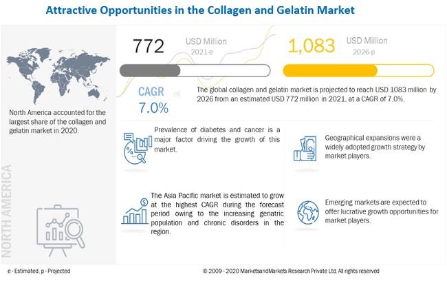 The Research Report on”Collagen & Gelatin Market by Source (Bovine, Porcine, Marine), Application (Wound Care, Orthopedic, Cardiovascular Disease, Dental, Surgical, Dural), End User (Hospitals, Surgical Centers) and Region – Global Forecast to 2026″, is projected to reach 1,083 million by 2026 from USD 772 million in 2021, at a CAGR of 7.0% during the forecast period.Growth Driver: Growing incidence of diabetes, cancer, and chronic wounds;