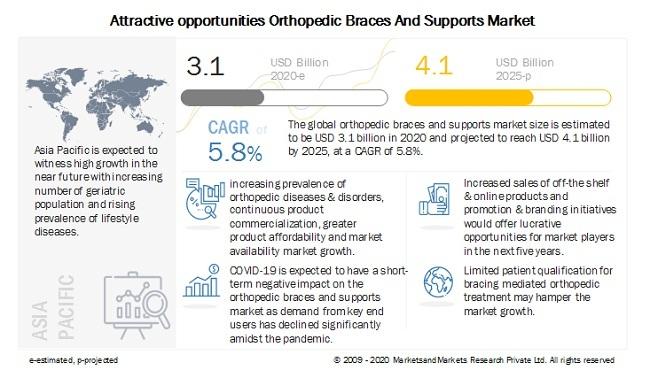 The Research Report on "Orthopedic Braces and Supports Market by Product (Knee, Ankle, Hip, Spine, Shoulder, Neck, Elbow, Hand, Wrist), Category (Soft, Hard, Hinged), Application (Ligament (ACL, LCL), Preventive, OA), Distribution (Hospital) & Region - Global Forecast to 2025", the global orthopedic braces market size is estimated to be USD 3.1 billion in 2020 and projected to reach USD 4.1 billion by 2025, at a CAGR of 5.8 %Growth Driver: Increasing prevalence of orthopedic diseases and disorders;