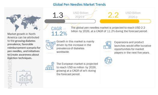 The Research Report on "Pen Needles Market by Type (Standard Pen Needles, Safety Pen Needles), Length (4mm, 5mm, 6mm, 8mm, 10mm, 12mm), Therapy (Insulin, GLP 1, Growth Hormone), and Mode of Purchase (Retail, Non-Retail) - Global Forecast to 2026", is expected to reach USD 2.2 Billion by 2026 from an estimated USD 1.3 Billion in 2021, at a CAGR of 11.2%.Growth Driver: Growing prevalence of chronic diseases;