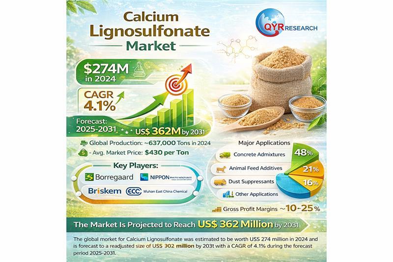 The global market for Calcium Lignosulfonate was estimated to be worth US$ 274 million in 2024 and is forecast to a readjusted size of US$ 362 million by 2031, expanding at a CAGR of 4.1% during the forecast period 2025-2031.
