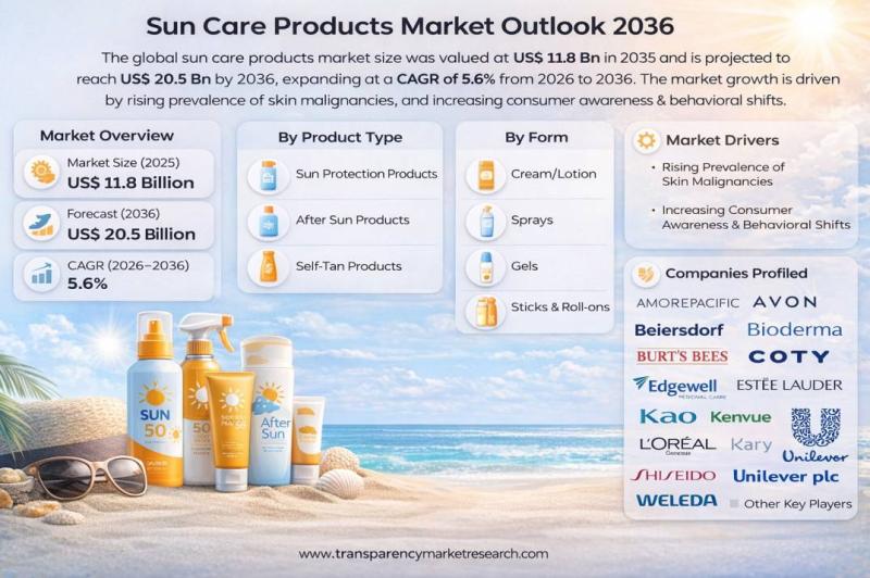 The global sun care products market was valued at US$ 11.8 Billion in 2025 and is projected to reach US$ 20.5 Billion by 2036, expanding at a compound annual growth rate (CAGR) of 5.6% from 2026 to 2036. Market growth is primarily driven by the rising prevalence of skin malignancies worldwide and increasing consumer awareness accompanied by long-term behavioral shifts toward preventive skincare.