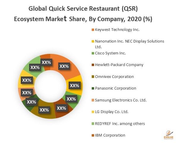 Some of the major Quick Service Restaurant (QSR) Ecosystem players holding highest market share include Keywest Technology Inc., Nanonation Inc. NEC Display Solutions Ltd., Cisco System Inc., Hewlett-Packard Company. These players use new product development as a key strategy to gain significant market share to compete with market leaders.