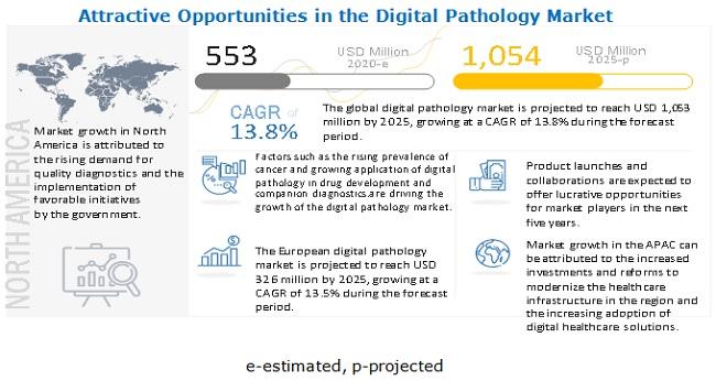 According to the new market research report "Digital Pathology Market by Product (Artificial Intelligence, Scanner, Software, Storage), Type (Human, Veterinary), Application (Teleconsultation, Disease Diagnosis, Drug Discovery), End-User (Pharmaceutical Companies, Hospitals) - Global Forecast to 2025", published by MarketsandMarkets™, is projected to reach USD 1,054 million by 2025 from USD 553 million in 2020, at a CAGR of 13.8% during the forecast period.Browse in-depth TOC on "Digital Pathology Market"