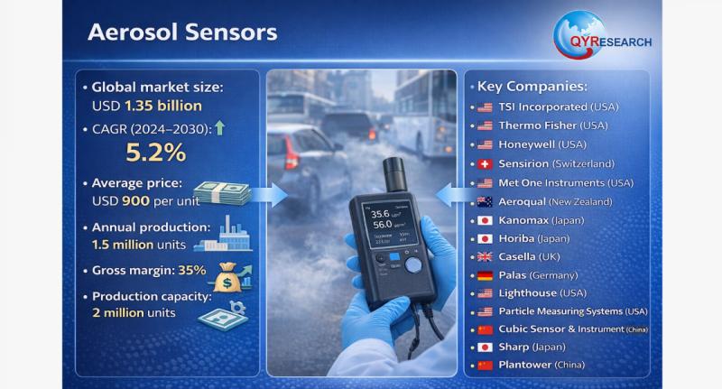 QY Research has released a comprehensive new market report on Aerosol Sensor, a device used to detect, measure, and monitor airborne particles-such as dust, smoke, mist, fumes, and biological aerosols-in real time. These sensors quantify particle concentration, size distribution, and mass concentration in indoor or outdoor environments. https://www.qyresearch.com/reports/5543984/aerosol-sensors Core Market Data Global market size: USD 1.35 billion CAGR (2024-2030): 5.2% Average price: USD 900 per unit Annual production: 1.5 million units Gross margin: 35% Production capacity: 2 million