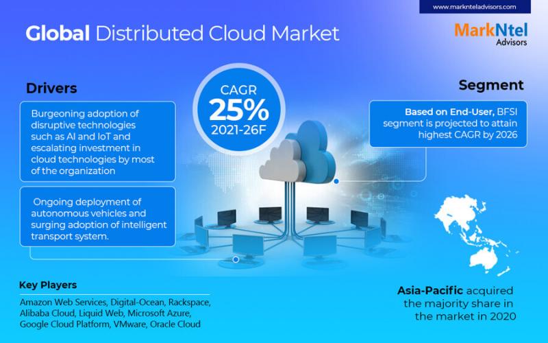 The Global Distributed Cloud Market is expecting around 25% CAGR during 2021-26, says MarkNtel Advisors.The research report Global Distributed Cloud Market cites a detailed analysis of market size, share, growth factors & restraints, recent developments by the leading players, & key trends, among others. The research study would help readers understand market analysis in terms of both revenue & volume, along with the qualitative impact of various factors on market segments across different geographies.