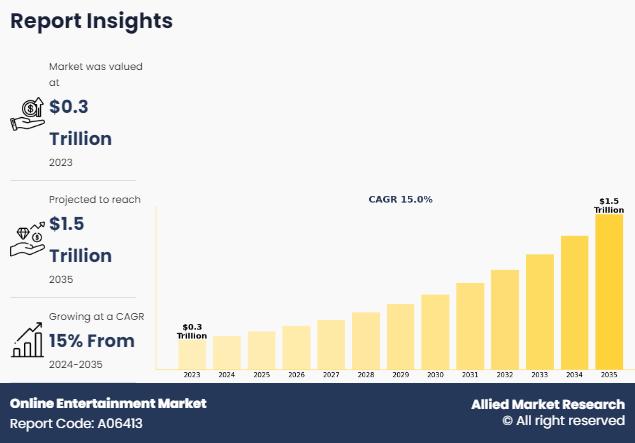 According to a new report published by Allied Market Research, titled, "Online Entertainment Market," The online entertainment market was valued at $284.8 billion in 2023, and is estimated to reach $1500.6 billion by 2035, growing at a CAGR of 15% from 2024 to 2035.