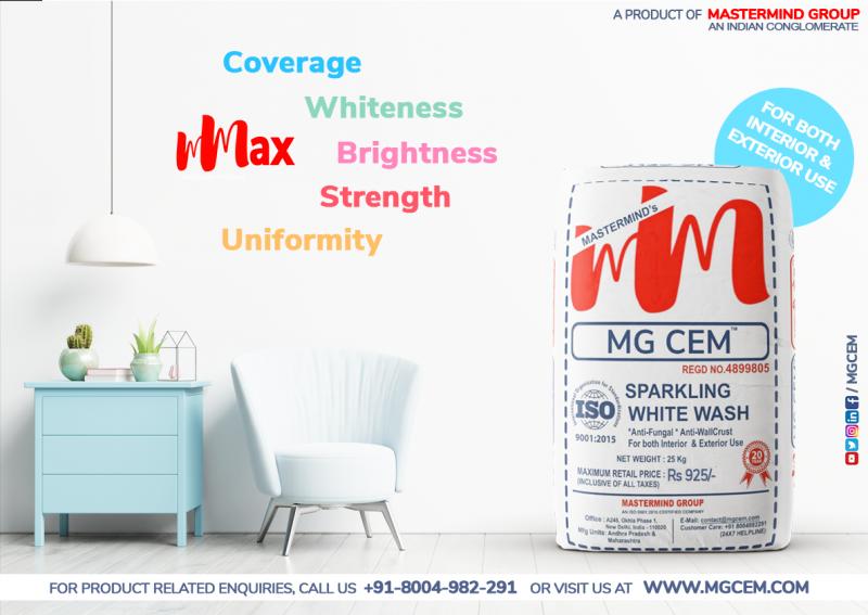 Mastermind Group's MG CEM, the leading premium whitewash brand in India, has positioned itself as the "Largest supplier and exporter of Premium Quality WhiteWash/White Cement Wash". MG CEM is the first-of-its-kind premium white cement wash that has an exceptionally high covering ratio, sparkling white color, and gives an economical wall finish. It is far more superior and lasts much longer than ordinary Lime Wash or WhiteWash.Exceptional features of the premium MGCEM WhiteWash include: