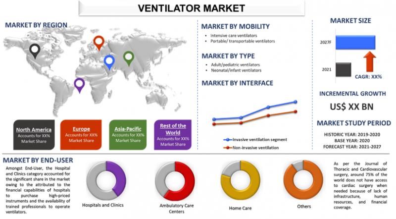 Global Ventilators Market is estimated to witness ~8% CAGR between 2021 and 2027. The surging elderly population along with the growing incidence of chronic respiratory disorders is anticipated to boost the demand for mechanical ventilators. Significant rising awareness of lung cancer symptoms and an increase in hospital admissions will fortify the demand for excellent treatment choices offering enormous growth opportunities. Furthermore, the global market is witnessing an uptick on account of the surging prevalence of the cardiovascular disease, the aging population, and other cardio-related problems that increases the possibility of cardiac arrest. As per the WHO, CVDs are the number 1 cause of death globally and approximately 31% of total deaths happened due to CVDs. Moreover, the rising global aging population who are more prone to the diseases are acting as a growth catalyst to the industry.A ventilator, breathing machine, or respirator is a machine that assists with breathing. It is mainly used in hospitals to treat chronic obstructive pulmonary disease (COPD), sleep apnea, acute lung injury, and hypoxemia. The market is experiencing significant growth on account of the rising incidence of Asthma and COPD cases, rise in the aging population, increasing prevalence of tobacco smoking, growing urbanization and pollution, increase in the preterm birth cases, and lifestyle changes.
