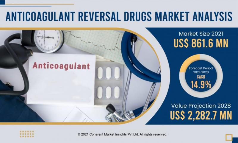 The global anticoagulant reversal drugs market is estimated to be valued at US$ 861.6 million in 2021 and is expected to exhibit a CAGR of 14.9% during the forecast period (2021-2028)