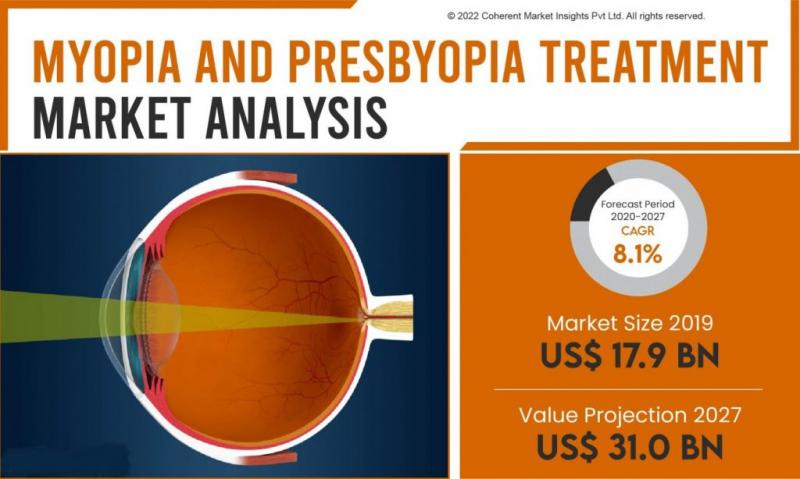The global myopia and presbyopia treatment market is estimated to be valued at US$ 17.9 Billion in 2020 and is expected to exhibit a CAGR of 8.1% over the forecast period (2020-2027).