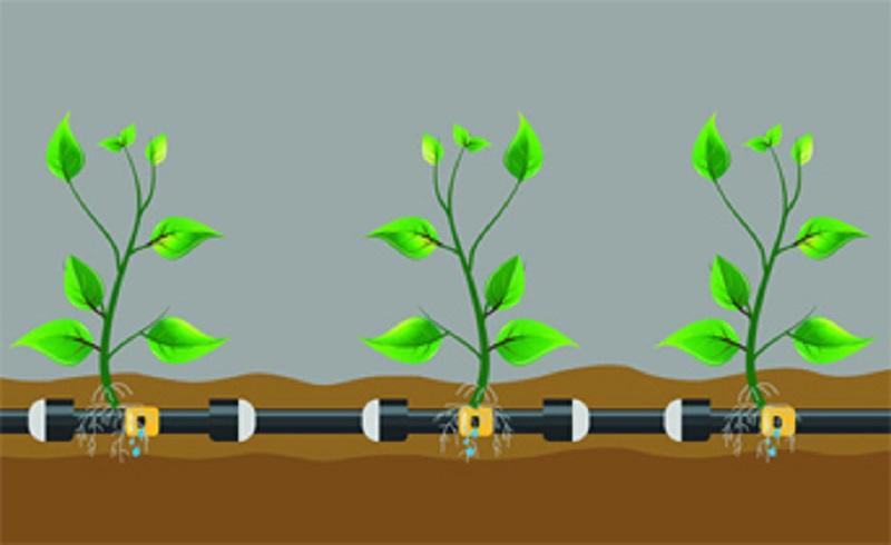 Drip Irrigation is an example of a micro-irrigation method where water is delivered to the roots of plants through a system of tubes, pipes, and emitters. This system uses water that is slowly applied to the soil directly at the roots of the plants. It resembles natural raindrops. The word "drip", which is the method of water dripping onto the soil, comes from this.