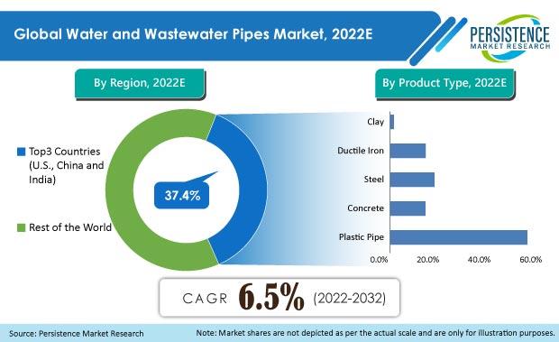 The global water and wastewater pipes market is anticipated to witness a growth rate of around 6.5% over the decade (2022-2032). Market growth is mainly attributed to rise in urbanization, growing construction sector, and increased government spending on water infrastructure.Use of water and wastewater pipes has seen significant growth since the past few years, prominently due to increasing investments in water infrastructure by various governments. Additionally, international organizations such as the World Bank also offer financial assistance for improving water infrastructure in economically developing countries.