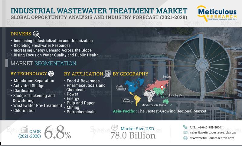 According to a new market research report titled "Industrial Wastewater Treatment Market by Treatment Technology (Membrane Separation, Activated Sludge, Clarification, Membrane Bio-reactor, Sludge Digestion), and Application (Manufacturing, Power, Energy, Mining) - Global Forecast to 2028', The Industrial Wastewater Treatment Market is expected to reach a value of USD 78 billion by 2028, at a CAGR of 6.8% during the forecast period 2021-2028.Download Sample Research PDF Here :- https://www.meticulousresearch.com/download-sample-report/cp_id=5170