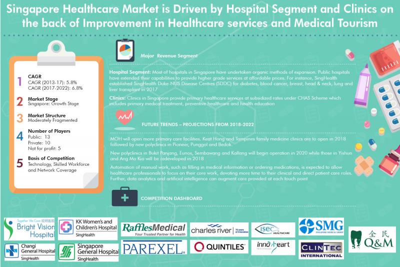 According to the report analysis, 'Singapore Healthcare Market Forecast to 2022 - by Type of Clinics (Medical and Dental), by Hospitals (Private, Public and Not-for-Profit), by Prescription and OTC Drugs, by type of Medical Devices (Consumables, Diagnostic Imaging, Patient Aids, Orthopedics & Prosthetics, Dental Products and Others)' states that Singapore Medical group, Q&M Dental Group, Singapore General Hospital, Changi General Hospital, GSK, Singapore, Beacon pharmaceuticals, Guardian Pharmacy, Unity Pharmacy, Singapore Clinical Research Institute, QT Vascular, Biosensors International, National Healthcare Group Diagnostics, Innovative Diagnostics and Radlink are the key companies which recently working in the Singapore Healthcare Market more efficiently for leading the highest market growth, generating the highest percentage of revenue, obtaining the competitive edge, keep maintaining the governing position, registering the great value of market share and maintaining the governing position by analysing the strategies and policies of government as well as contenders, spreading the awareness connected to the applications and advantages of developed healthcare infrastructure, delivering the better customer satisfaction, increasing the features and benefits of healthcare expenditure, implementing the policies of profit making and strategies of expansion, improving the qualitative and quantitative measures of such and establishing the several research and development programs.
