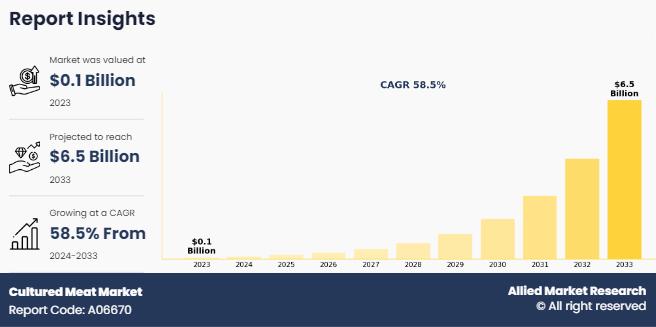 The cultured meat industry was valued at $65.2 million in 2023, and is estimated to reach $6,501.8 million by 2033, growing at a CAGR of 58.5% from 2024 to 2033.