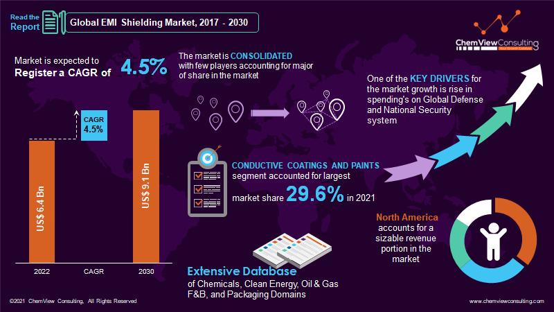 Global EMI Shielding Market is estimated to witness a growth rate of 4.5% over the forecast period due to its fast-rising demand from the telecommunication industry - according to ChemView Consulting's AnalystAccording to a research survey conducted by ChemView Consulting, in 2022, the worldwide EMI Shielding Market was worth US$ 6.4 Bn and is expected to grow at a CAGR of 4.5% over the forecast period. The market is expected to hit US$ 9.1 Bn by 2030 end.