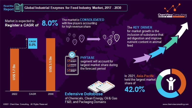 Global Industrial Enzymes for Feed Industry Market is estimated to witness a growth rate of 8.0% over the forecast period to create better solutions for replacing nutritional deficiencies in animals - according to ChemView Consulting's Analyst.According to a research survey conducted by ChemView Consulting, in 2022, the Global Industrial Enzymes for Feed Industry Market was worth US$ 1.7 Bn and is expected to grow at a CAGR of 8.0% over the forecast period. The market is expected to hit US$ 3.1 Bn by 2030 end.