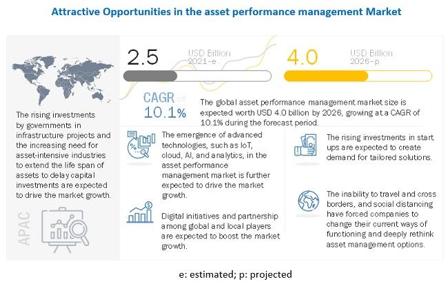 According to a new market research report "Asset Performance Management Market with COVID-19 Impact, by Component (Solutions (Asset Strategy, Asset Reliability, and Predictive Asset Management) and Services), Deployment Type, Organization Size, Vertical, and Region - Global Forecast to 2026" published by MarketsandMarkets™, the market size expected to grow at a Compound Annual Growth Rate (CAGR) of 10.1% during the forecast period, to reach USD 4.0 billion by 2026 from USD 2.5 billion in 2021.Download PDF Brochure @ https://www.marketsandmarkets.com/pdfdownloadNew.asp?id=72801714