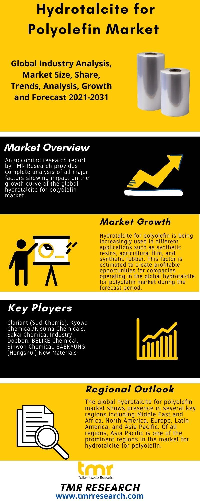 An upcoming research report by TMR Research provides complete analysis of all major factors showing impact on the growth curve of the global hydrotalcite for polyolefin market. Thus, this assessment delivers comprehensive study of important elements such as the growth drivers, growth restraints, investment opportunities, historical and current trends, challenges, and R&D activities in the market. In addition, it also provides insights on the competition analysis and regional analysis of the hydrotalcite for polyolefin market. Moreover, this study enlightens readers on important statistics such as the sales, production, shares, volume, and revenues of all key players operating in the market for hydrotalcite for polyolefin. Thus, the report works as a valuable guide in order to gain in-depth insight on the global hydrotalcite for polyolefin market for the forecast period of 2021 to 2031.