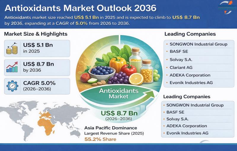 The global antioxidants market was valued at US$ 5.1 Billion in 2025 and is projected to reach US$ 8.7 Billion by 2036, expanding at a CAGR of 5.0% from 2026 to 2036. The market is witnessing steady growth driven by increasing health awareness, expanding food preservation applications, rising demand for functional foods, and growing use of antioxidants in cosmetics and pharmaceuticals.