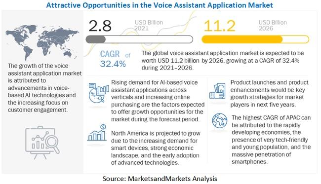 Voice Assistant Application Market size projected to grow from USD 2.8 billion in 2021 to USD 11.2 billion by 2026, at a Compound Annual Growth Rate (CAGR) of 32.4% during the forecast period. Major factors driving the growth of the voice assistant application market include advancements in voice-based AI technologies, rising adoption of voice-enabled devices, increasing focus on customer engagement, and emergence of low-code platforms for voice assistant applications.Download PDF Brochure @ https://www.marketsandmarkets.com/pdfdownloadNew.asp?id=141810993