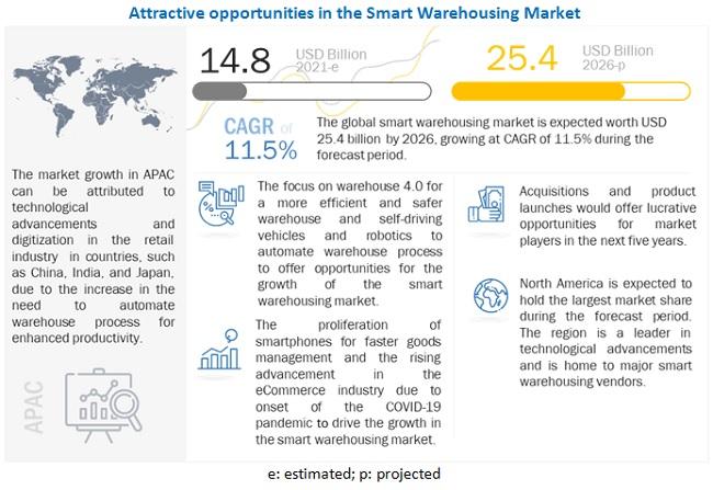 According to MarketsandMarkets™, global Smart Warehousing Market size to grow from USD 14.8 billion in 2021 to USD 25.4 billion by 2026, at a Compound Annual Growth Rate (CAGR) of 11.5% during the forecast period. Various factors such as the proliferation of smartphones for faster goods management, the rising advancement in the eCommerce industry due to the onset of the COVID-19 pandemic, the emergence of multi-channel distribution networks, and the dynamic nature and globalization of supply chain networks are expected to drive the adoption of smart warehousing hardware, solutions, and services. However, the market faces restraints, such as a lack of uniform governance standards in the fragmented logistics industry and growing data security and privacy concerns.Download PDF Brochure @ https://www.marketsandmarkets.com/pdfdownloadNew.asp?id=199732421