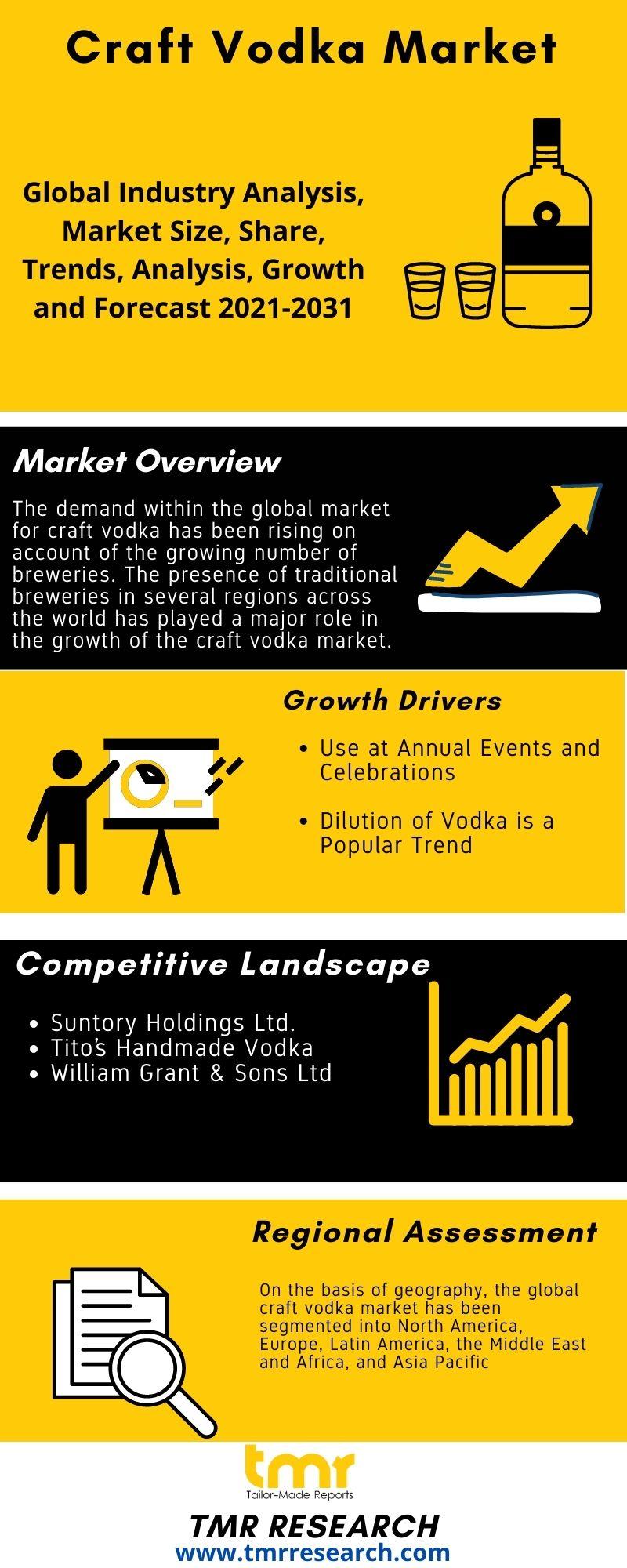 Global Craft Vodka Market - SnapshotPlayers as well as craft breweries operating within the global craft vodka market produce their products in small batches while paying extra attention to the quality as well as the quantity of specific ingredients used in production. Products in the global craft vodka market are widely popular for their unique flavors, bold experiments, and possibility of countless permutations and combinations when mixed with other beverages. Products in the global craft vodka market can be manufactured using various natural ingredients such as wheat, beets, milk, coffee, corn, and potatoes, among others.