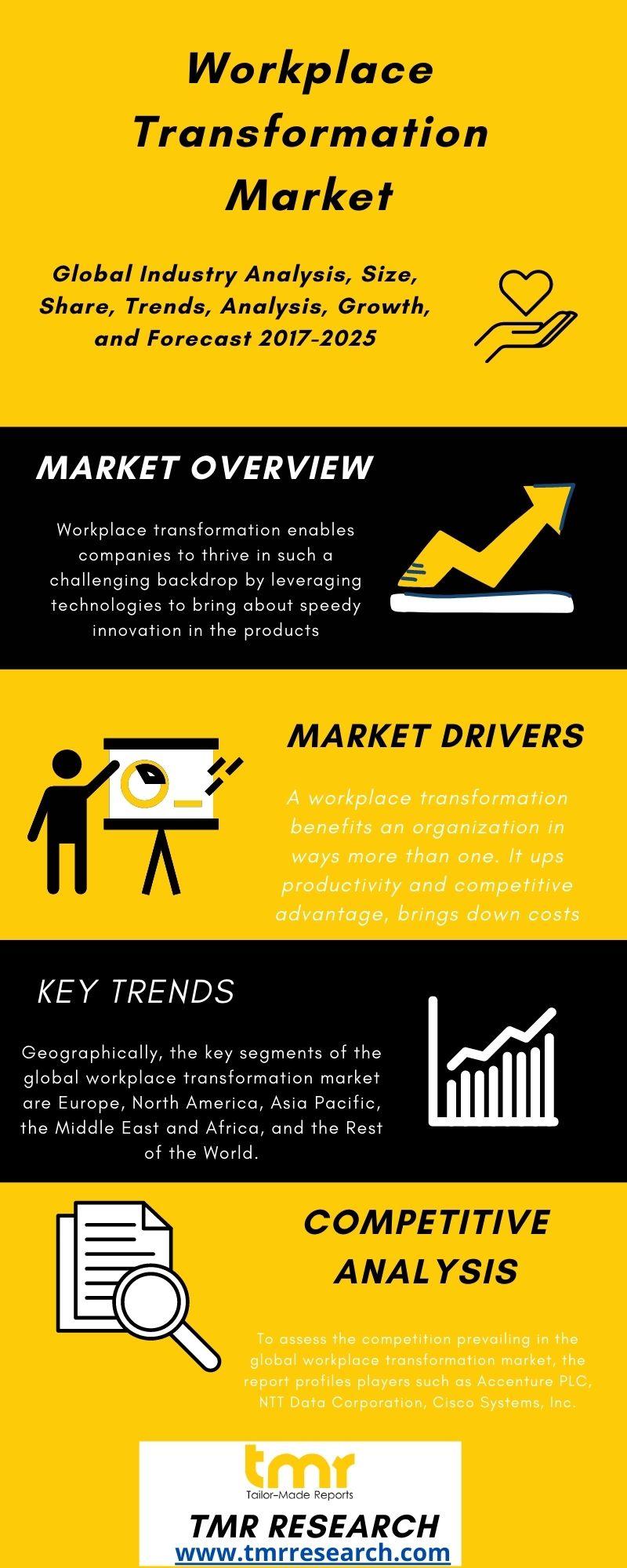The transformation in the workplace, particularly digital, provides flexibility and agility to workers, improving their overall performance and productivity. A number of business organizations across the world are acknowledging the need for renovating and transforming their workplace, which, in turn, is expected to boost the global market for workplace transformation in the years to come.
