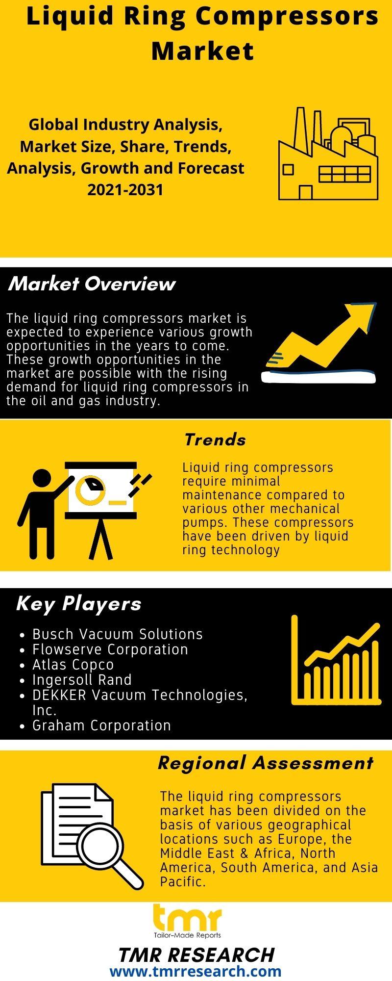 Liquid Ring Compressors Market: OverviewThe liquid ring compressors market is expected to experience various growth opportunities in the years to come. These growth opportunities in the market are possible with the rising demand for liquid ring compressors in the oil and gas industry. In addition to this, growing emission levels along with the rising use of fuel in the compresThe liquid ring compressors market is expected to experience various growth opportunities in the years to come. These growth opportunities in the market are possible with the rising demand for liquid ring compressors in the oil and gas industry. In addition to this, growing emission levels along with the rising use of fuel in the compressed air systems are also fueling demand opportunities for eco-friendly compressors.sed air systems are also fueling demand opportunities for eco-friendly compressors.