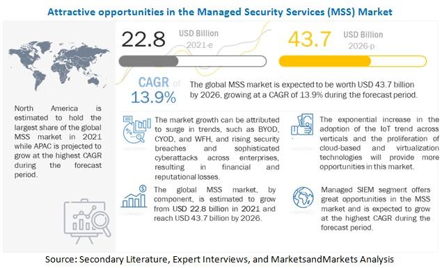 According to MarketsandMarkets™, the global Managed Security Services (MSS) Market size is projected to grow from USD 22.8 billion in 2021 to USD 43.7 billion by 2026, at a Compound Annual Growth Rate (CAGR) of 13.9% during the forecast period.Download PDF Brochure @ https://www.marketsandmarkets.com/pdfdownloadNew.asp?id=5918403