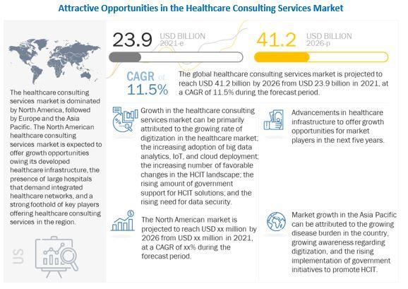 According to the new market research report "Healthcare Consulting Services Market by Type of Service (Digital Health, IT, Operations, Strategy, Financial, HR & Talent), End User (Government Bodies, Healthcare Providers, Pharmaceutical & Biotechnology Companies), and Region - Global Forecasts to 2026", published by MarketsandMarkets™, the global market is projected to reach USD 41.2 billion by 2026 from USD 23.9 billion in 2021, at a CAGR of 11.5% during the forecast period.Browse in-depth TOC on "Healthcare Consulting Services Market"