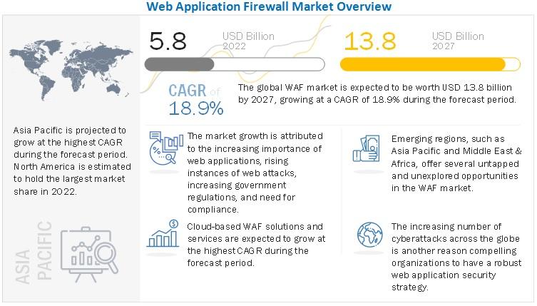 According to MarketsandMarkets the "Web Application Firewall Market" size is estimated to grow from USD 5.8 billion in 2022 to USD 13.8 billion by 2027, at a Compound Annual Growth Rate (CAGR) of 18.9% during the forecast period. The Web Application Firewall Market is fuelled by the increasing importance of web applications. Moreover, the government regulations and need for compliance plays a key role in driving the growth of the Web Application Firewall Market.Download PDF Brochure @ https://www.marketsandmarkets.com/pdfdownloadNew.asp?id=176479811