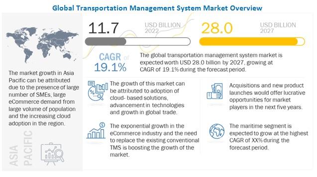 Transportation Management System Market size is expected to grow from USD 11.7 billion in 2022 to USD 28.0 billion by 2027, at a Compound Annual Growth Rate (CAGR) of 19.1% during the forecast period.Download PDF Brochure @ https://www.marketsandmarkets.com/pdfdownloadNew.asp?id=232446179