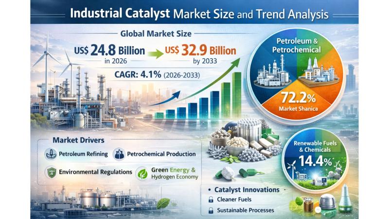 The global Industrial Catalyst Market is witnessing steady expansion, supported by increasing demand from petroleum refining and petrochemical industries across major economies. According to the latest study by Persistence Market Research, the market is expected to be valued at US$ 24.8 billion in 2026 and is projected to reach US$ 32.9 billion by 2033, growing at a CAGR of 4.1% between 2026 and 2033. Catalysts play a critical role in…