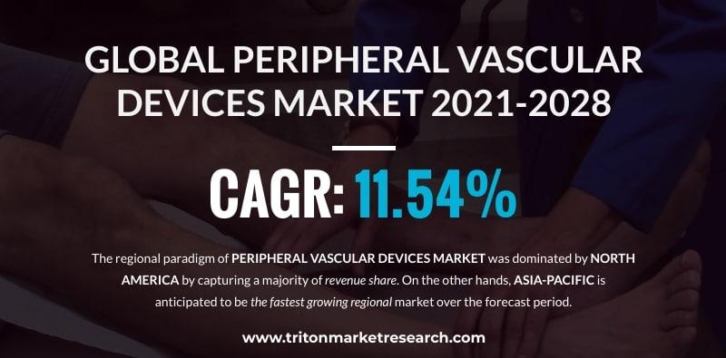 Triton Market Research presents the Global Peripheral Vascular Devices Market report segmented by Device Type (Peripheral Vascular Stents [Self-expanding Peripheral Vascular Stents, Balloon-expanding Peripheral Vascular Stents, Drug-eluting Peripheral Vascular Stents, Covered Stent], Percutaneous Transluminal Angioplasty (PTA) Balloon Catheters [Standard PTA Balloon Catheters, High-Pressure PTA Balloon Catheter, Large PTA Balloon Catheter, Small PTA Balloon Catheter, Specialty PTA Balloon Catheter, Drug Coated PTA Balloon Catheter], Percutaneous Transluminal Angioplasty (PTA) Guidewires, Atherectomy Devices, Embolic Protection Devices, Inferior Vena Cava Filters, Other Device Types), and by Geographical Region (North America, Europe, Asia-Pacific, Latin America, Middle East and Africa), discussing Market Summary, Industry Outlook, Key Insights, Impact of COVID-19, Porter's Five Forces Analysis, Market Attractiveness Index, Vendor Scorecard, Key Market Strategies, Drivers, Restraints, Opportunities, Competitive Landscape, Methodology & Scope, Global Market Size, Forecasts & Analysis (2021-2028).As per a report by Triton Market Research, the Global Peripheral Vascular Devices Market is expected to progress at 11.54% of CAGR during the forecasting years (2021-2028).