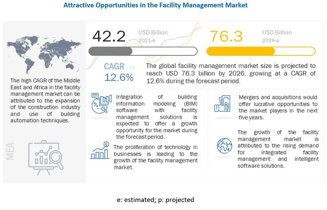 Facility Management Market size is estimated to grow from USD 42.2 billion in 2021 to USD 76.3 billion by 2026, at a Compound Annual Growth Rate (CAGR) of 12.6% during the forecast period. Various factors such as a surge in demand for cloud-based facility management solutions and rise in demand for facility management solutions integrated with intelligent software are expected to drive the adoption of facility management solutions and services.Download PDF Brochure @ https://www.marketsandmarkets.com/pdfdownloadNew.asp?id=1030