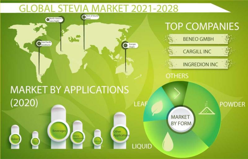 According to a new market research report launched by Inkwood Research, the Global Stevia Market is growing at a CAGR of 7.24% during the forecast period of 2021 to 2028, and is anticipated to generate $828.02 million by 2028.Browse 39 market data Tables and 42 figures spread over 145 Pages, along with in-depth analysis on Global Stevia Market by Application, Form & by Geography