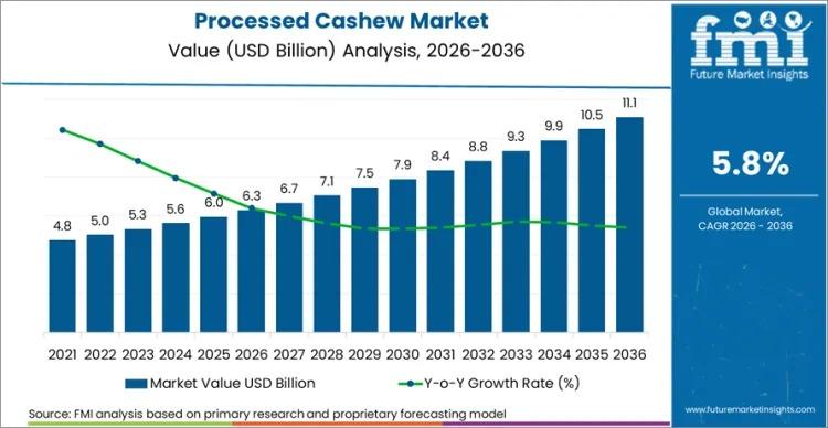The global processed cashew market is entering a decade of structural transformation. Valued at USD 6.3 billion in 2026, the industry is projected to reach USD 11.0 billion by 2036, expanding at a CAGR of 5.8%.