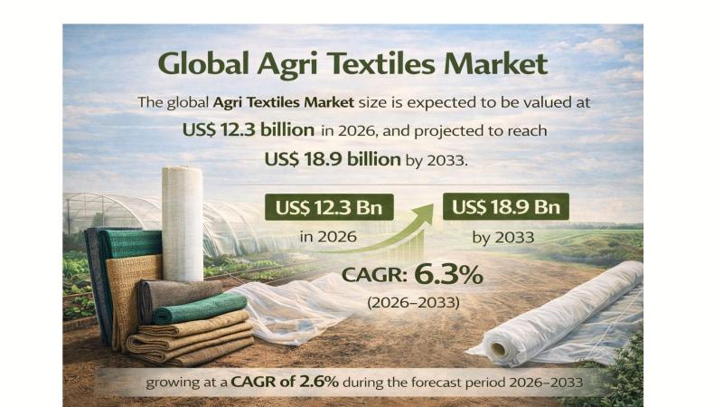 The global Agri Textiles Market is witnessing steady expansion, driven by the increasing need for enhanced agricultural productivity and sustainable farming practices. The market is expected to be valued at US$ 12.3 billion in 2026 and is projected to reach US$ 18.9 billion by 2033, growing at a CAGR of 6.3% between 2026 and 2033. Agri textiles, which include woven, non-woven, and knitted fabrics used in agriculture, play a vital…