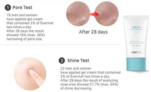 Shine Test: 22 men and women applied gel cream that contained 3% of Evermat two times a day. After 28 days, the result of analyzing the nose area showed 21.7% (max. 55%) of shine decreasing.