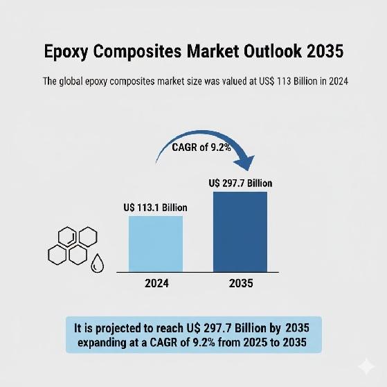 The global epoxy composites market is entering a transformative growth phase, supported by rising demand for lightweight materials, advanced manufacturing technologies, and expanding applications across transportation, wind energy, aerospace, and construction. Valued at US$ 113.1 Billion in 2024, the market is projected to grow at a CAGR of 9.2% from 2025 to 2035, ultimately reaching US$ 297.7 Billion by 2035. Epoxy composites, known for their exceptional strength-to-weight ratio, durability, corrosion…
