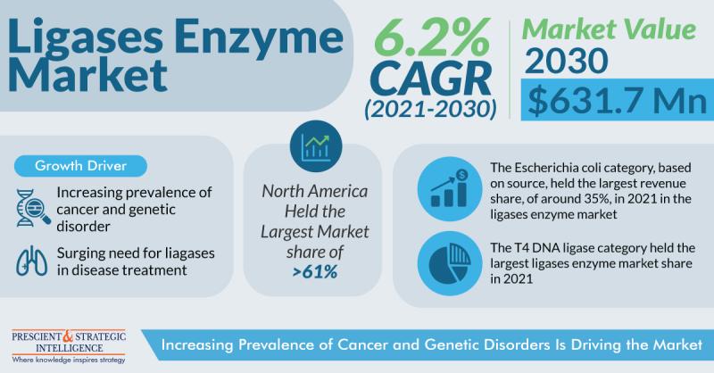 The ligases enzyme market revenue will be $631.7 million by 2030, growing from $367.4 million in 2021 at a 6.2% CAGR. This is attributed to the growing usage of these chemicals in the detection of infectious diseases and genetic abnormalities, along with the booming cancer burden.Get the sample pages of this report: https://www.psmarketresearch.com/market-analysis/ligases-enzyme-market-size/report-sample