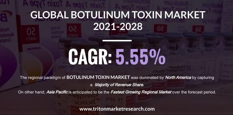 Triton's research report predicts the global botulinum toxin market to showcase a CAGR of 5.55% in terms of revenue over the forecasting duration between 2021 and 2028, generating a revenue worth $4744.35 million by the year 2028.