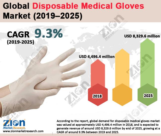 According to the report, the global demand for disposable medical gloves market was valued at approximately USD 4,496.4 million in 2018 and is expected to generate revenue of around USD 8,329.6 million by end of 2025, growing at a CAGR of around 9.3% between 2019 and the 2025.