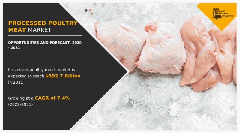 The global processed poultry meat market generated $252.4 billion in 2020, and is projected to reach $592.7 billion by 2031, witnessing a CAGR of 7.4% from 2022 to 2031.The report provides a detailed analysis of changing market dynamics, top segments, value chain, key investment pockets, regional scenario, and competitive landscape.