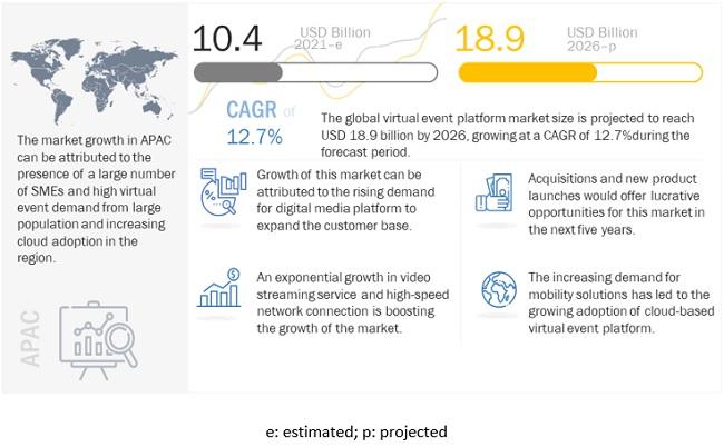 Virtual Event Platform Market size is expected to grow at a Compound Annual Growth Rate (CAGR) of 12.7% during the forecast period, to reach USD 18.9 Billion in 2026 from USD 10.4 Billion in 2021Download PDF Brochure: https://www.marketsandmarkets.com/pdfdownloadNew.asp?id=198777256