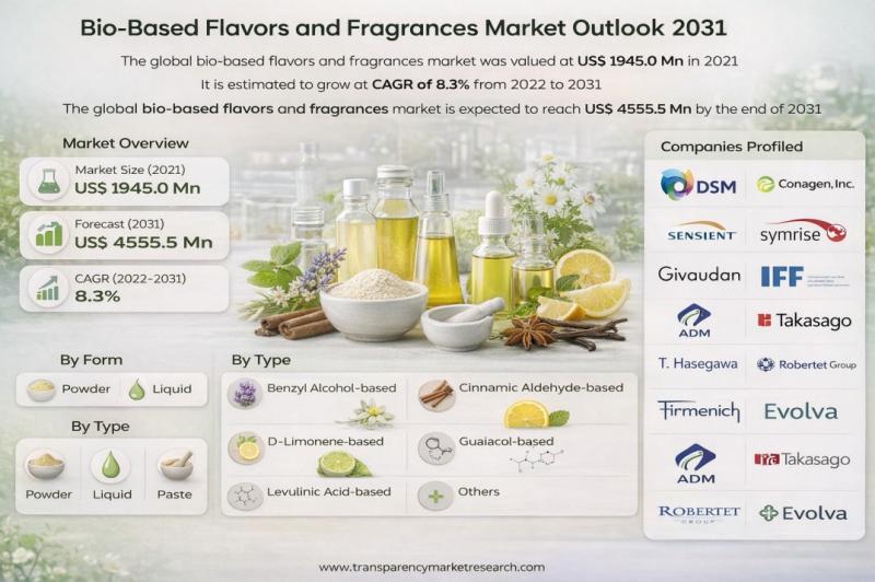 The global bio-based flavors and fragrances market was valued at US$ 1,945.0 Million in 2021 and is projected to reach US$ 4,555.5 Million by 2031, growing at a CAGR of 8.3% from 2022 to 2031. This robust growth is driven by increasing consumer preference for natural and health-oriented ingredients, rising adoption of eco-friendly cosmetic and food products, and expanding applications in the pharmaceutical industry.