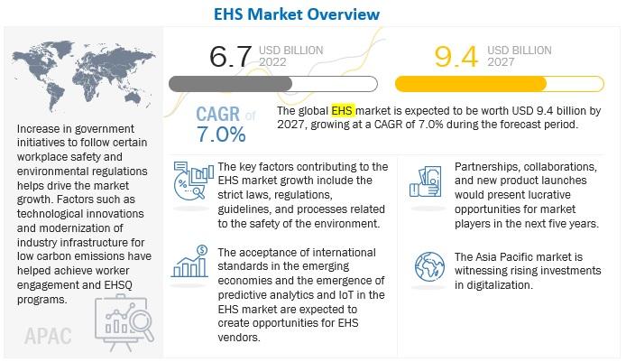 Environment, Health, and Safety Market size is projected to grow from USD 6.7 billion in 2022 to USD 9.4 billion by 2027, at a CAGR of 7.0% during the forecast period. The proliferation of the software-as-a-service deployment model is driving the growth of the EHS market.Browse 256 market data Tables and 39 Figures spread through 237 Pages and in-depth TOC on "Environment, Health, and Safety Market by Component (Software and Services (Project Deployment and Implementation Services, Audit, Assessment and Regulatory Compliance)), Deployment Mode (Cloud, On-premises), Vertical & Region - Global Forecast to 2027"