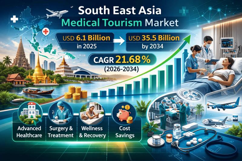 IMARC Group's latest research publication "South East Asia Medical Tourism Market Size, Share, Trends and Forecast by Treatment Type, Service Provider, and Country, 2026-2034" the South East Asia medical tourism market size reached USD 6.1 Billion in 2025. The market is expected to reach USD 35.5 Billion by 2034, exhibiting a growth rate (CAGR) of 21.68% during 2026-2034.