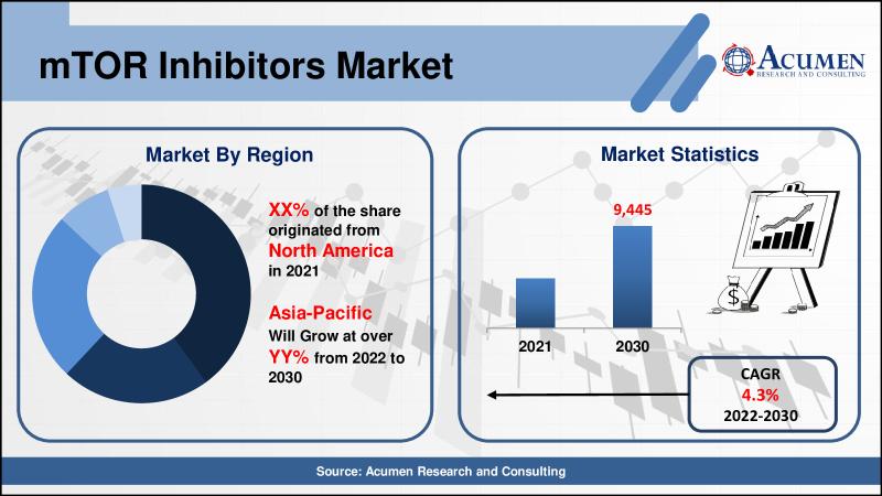 The Global mTOR Inhibitors Market size accounted for USD 6,498 Million in 2021 and is estimated to reach USD 9,445 Million by 2030, with a significant CAGR of 4.3% from 2022 to 2030.The mammalian target of rapamycin (mTOR) is known as a protein kinase, which controls growth factors that accelerate cell growth, metabolism, survival, and immunity. The mTOR pathway is more active in certain cancers. Inhibitors of the mammalian target of rapamycin (mTOR) are used to treat renal cancer and are being researched for use in other types of cancer. When mTOR inhibitors are merged with other chemotherapy agents, the benefits are greater.